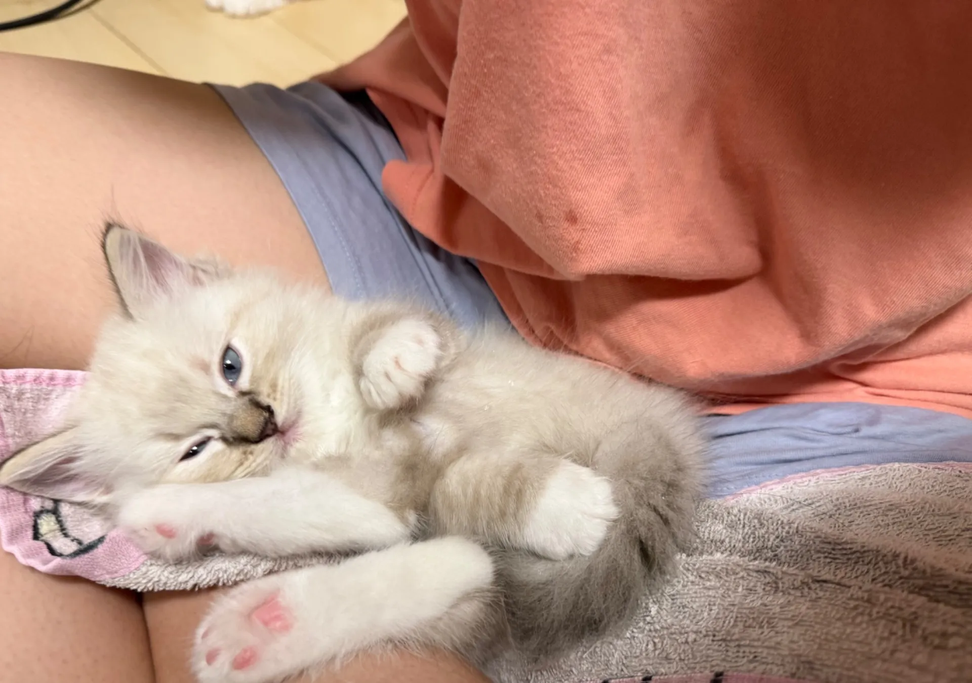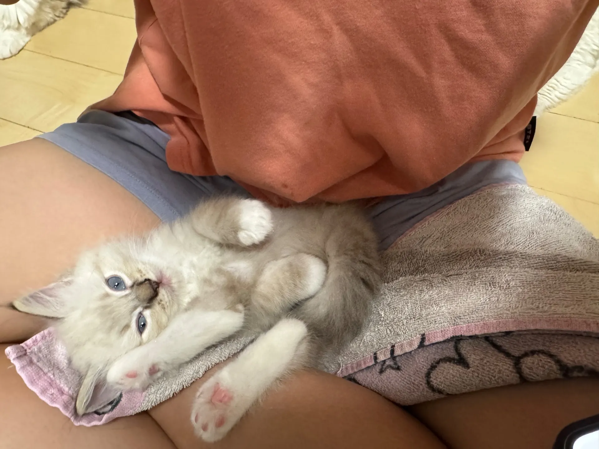 お姉ちゃんの上で満足そうにくつろいでます(╹◡╹)
